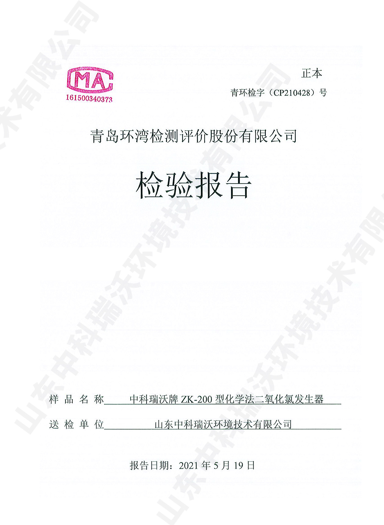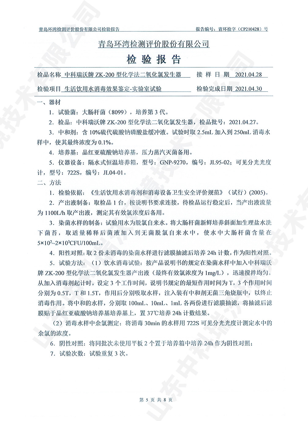 飲水消毒設備檢測報告~二氧化氯消毒